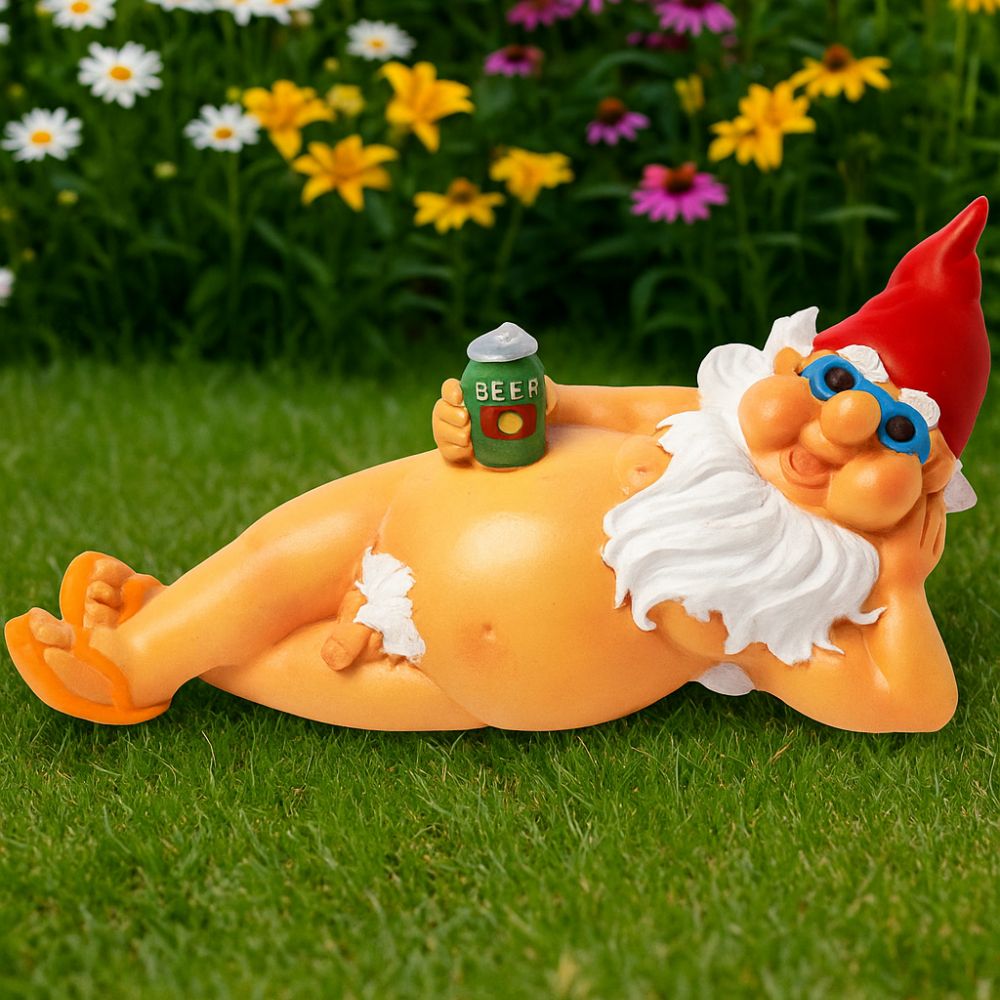 Ce gnome original bouscule les codes classiques du jardinage décoratif. Allongé, une bière à la main et sans aucun vêtement, il assume pleinement son naturel. Fabriqué en résine résistante, il est prêt à braver les intempéries... sans jamais rougir !
